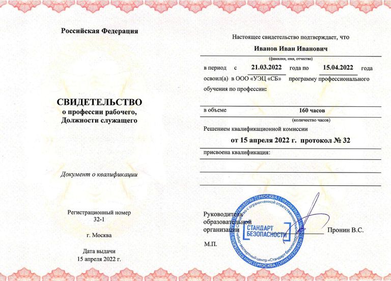 По итогам обучения выдается свидетельство о профессии или удостоверение о повышении квалификации установленного образца.